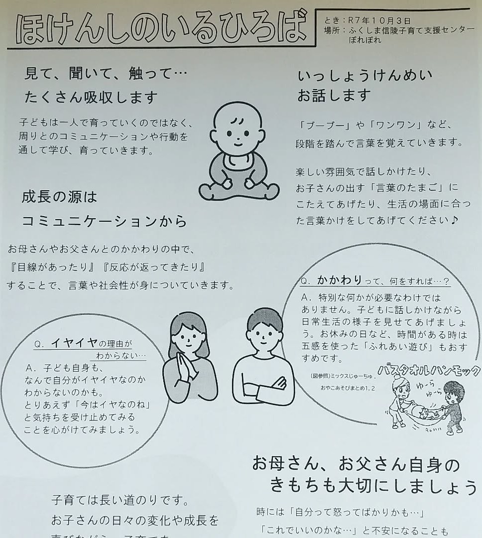 今日は、保健師さんのいるひろばがありました。ひろばで子どもを遊ばせながら、離乳食や子どもの気になることなど、リラックスした様子で保健師さんに話すママ達の姿が見られました
